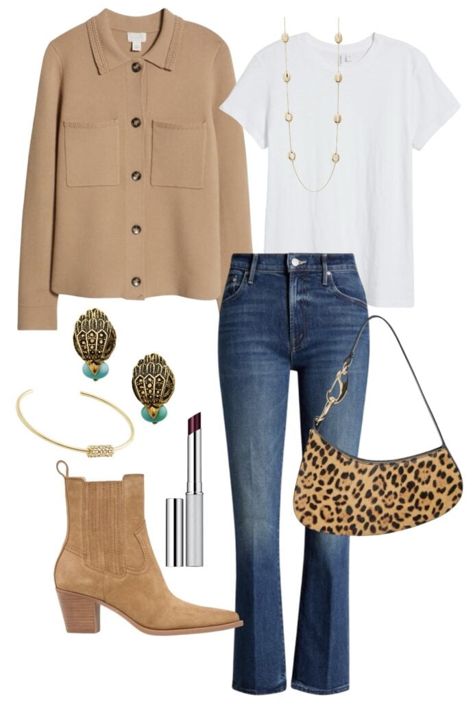 cardi jacket / white tee / Mother jeans / leopard bag / booties / long necklace / Kurt Geiger earrings / black honey almost lipstick / Coach bracelet