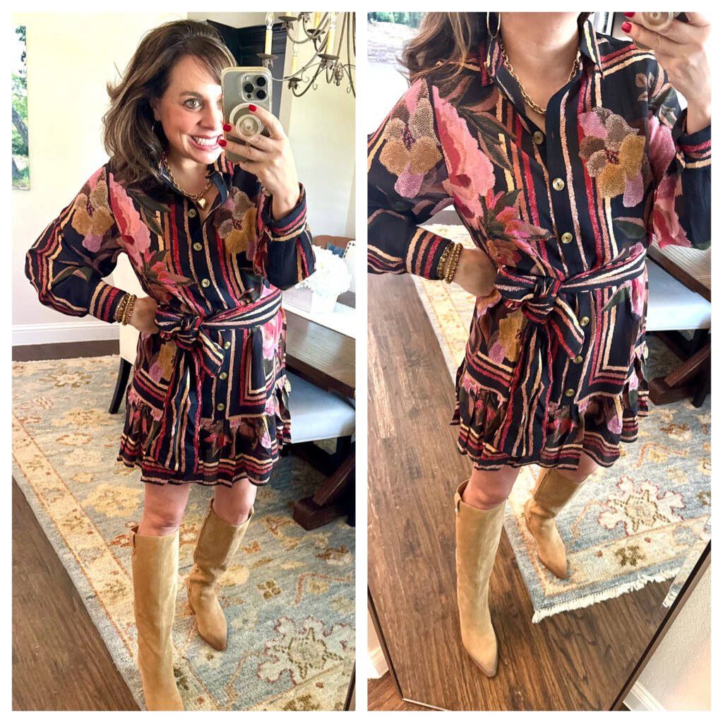 Farm Rio mini dress / heart toggle necklace / skinny hoop earrings / bracelet set / knee high boots