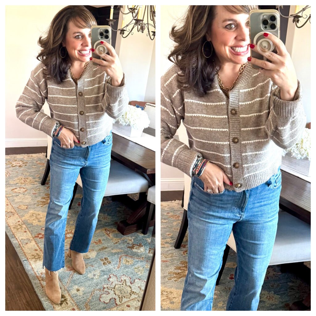 Wanted to show you the cardi with my must have ecru jeans too. Y’all know I’m obsessed with these jeans. They are ON SALE and starting to sell out (some sizes are already gone), so if you’ve been thinking about grabbing them, NOW is the time. Stretchy, comfy, flattering, and a great color for year-round wear. For size reference, I’m wearing my regular size 4.