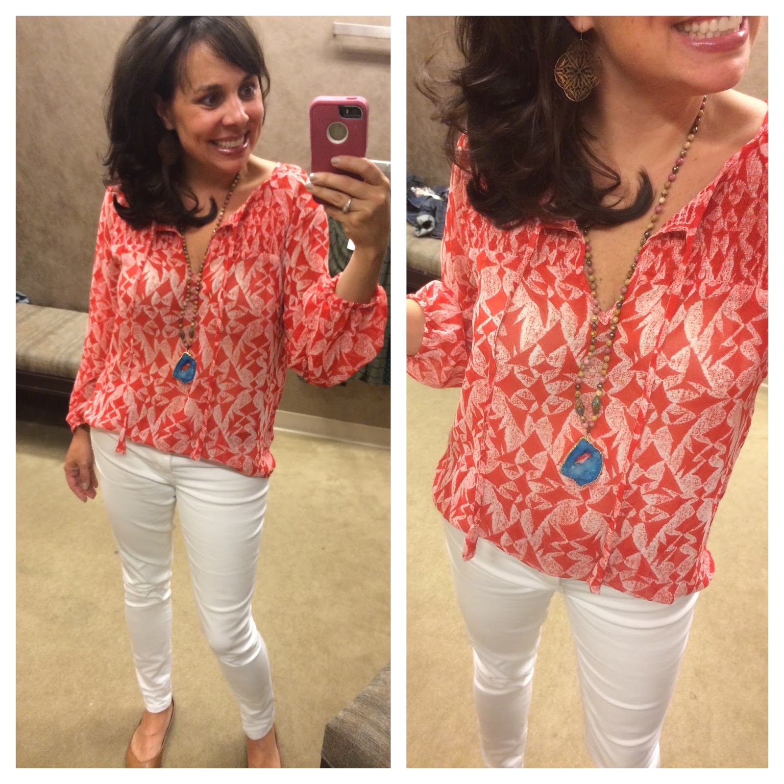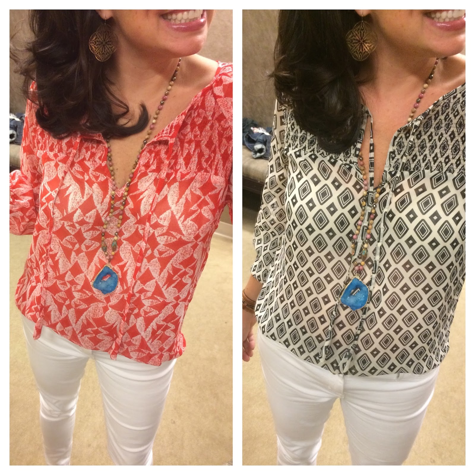 The website says the blouse above (also seen below on the left) is red, but when trying it on, I thought it leaned more orange. And here’s the same blouse in the ivory and black diamond pattern on the right. It would look great with black dress pants.