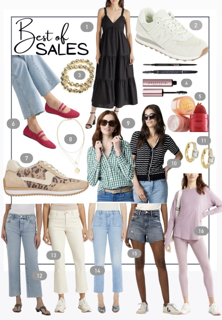 1) tiered sundress / 2) New Balance white sneakers / 3) bracelet duo / 4) eyebrow set / 5) body butters / 6) Rothy’s double buckle Mary Jane’s / 7) leopard sneakers / 8) layered necklace / 9) gingham button-up / 10) short sleeve cardi / 11) huggie earrings / 12) Kut from the Kloth jeans / 13) Wit and Wisdom ecru jeans / 14) Mother jeans / 15) Kut from the Kloth denim shorts / 16) slub tee