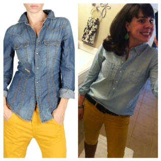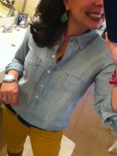 Oh my gosh!! I totally wore that outfit yesterday!! We were twins! Thank you so much for your inspiration or I would never have bought a denim shirt or mustard pants!