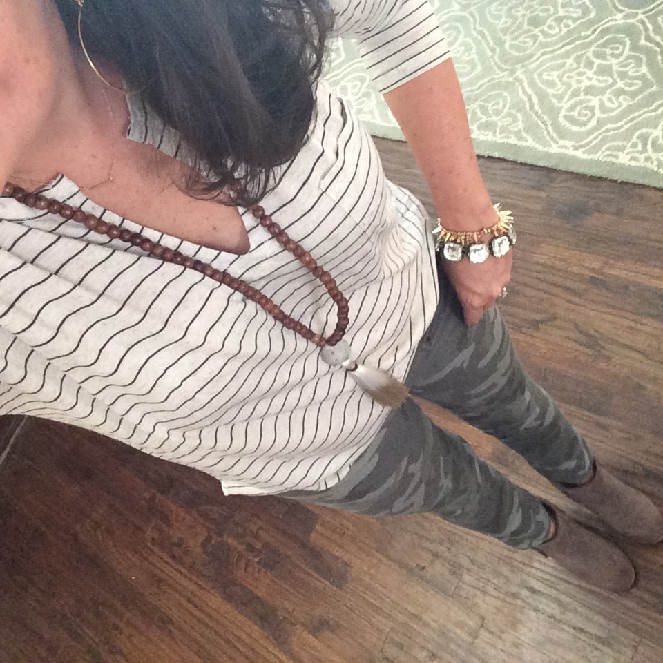 striped split neck tee / similar camo pants / wood bead ombre tassel necklace/ circle hoop earrings / similar taupe booties