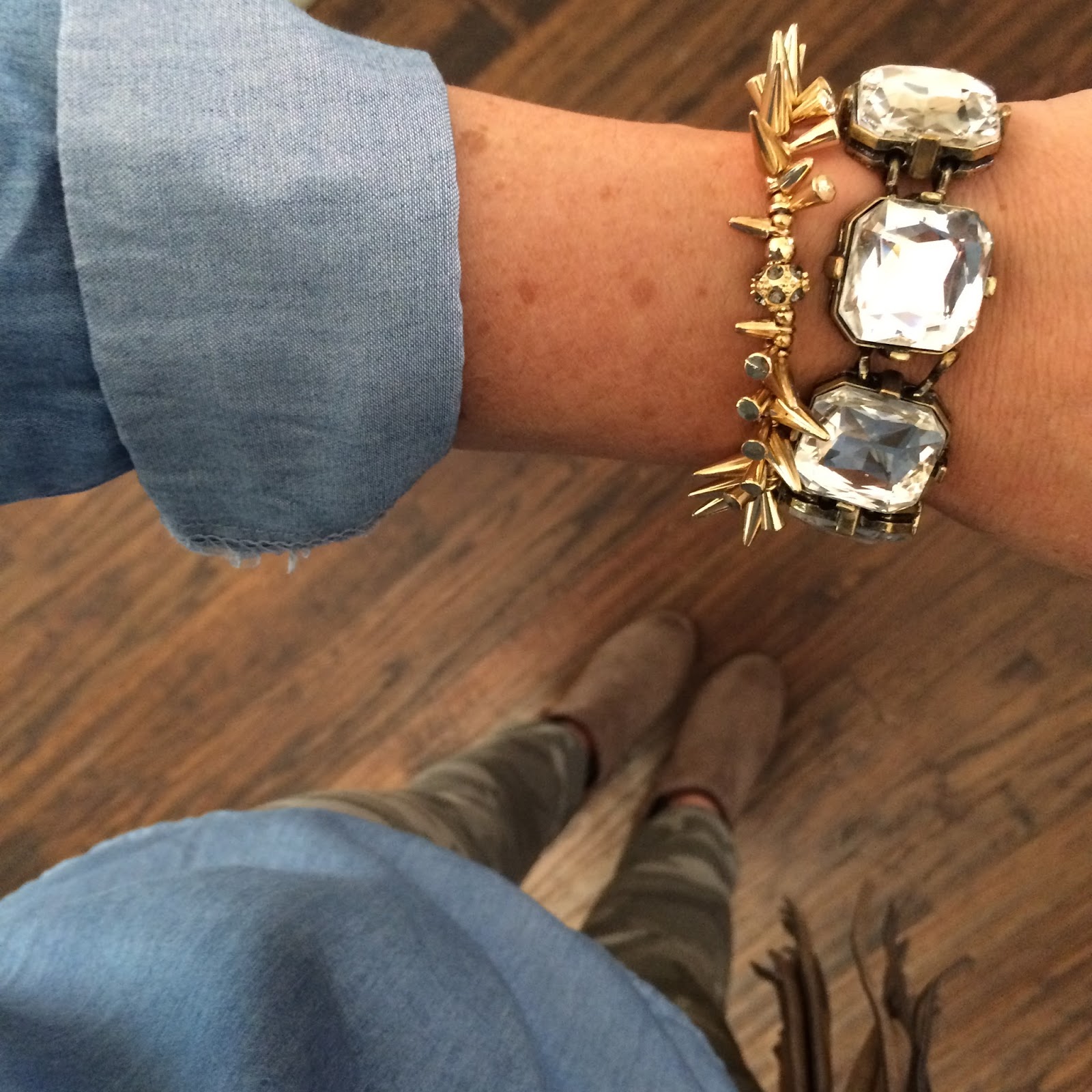 Pairing chambray with denim just makes sense to me. And when you layer on a fringe bag and a fun necklace, you’ve got a great look!