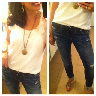 I have that Loft tank from years and years ago in pink / blush color, and I have the putty wedges… I think I MUST HAVE those jeans now : ) Great outfit!