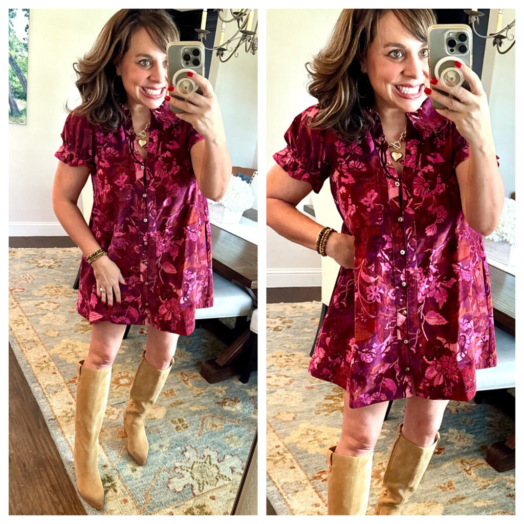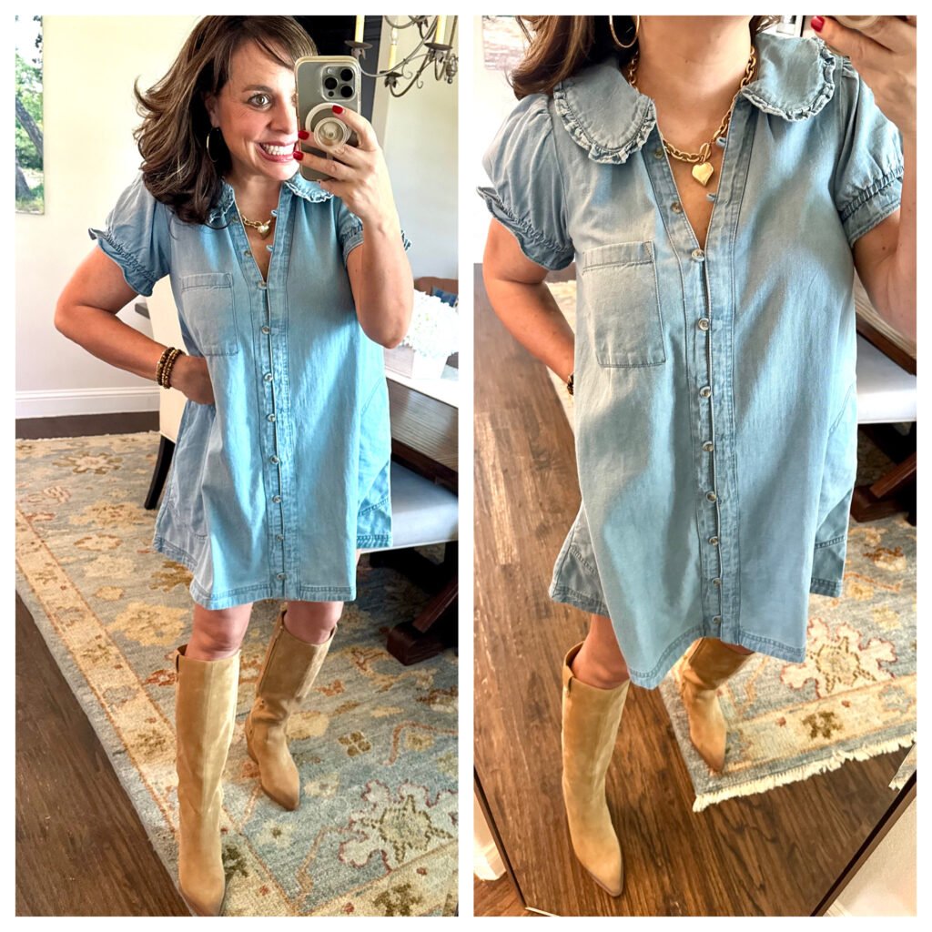We all know that the western vibe is big right now, and this chambray dress is adorable. I love the Peter Pan collar and the subtle puffed sleeves trimmed with the tiny gathered ruffles. It’s 100% cotton, lightweight, and when styling you could really lean into the cowboy vibe with cowboy boots and turquoise jewelry, or you could go a little more subtle with some simple gold jewelry and suede boots. I’ll be wearing this both ways. This would be a perfect dress for a country concert for sure! For size reference, I’m wearing a regular small here.