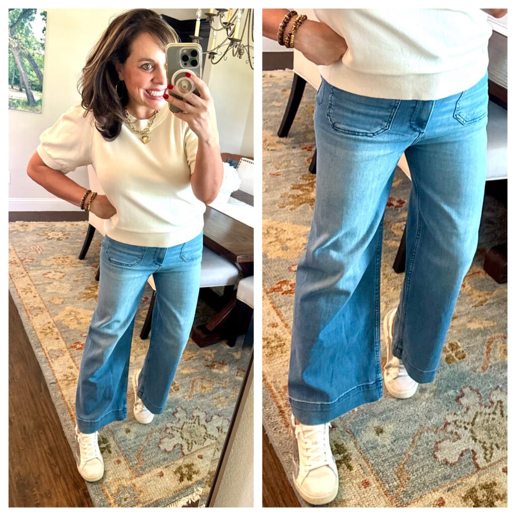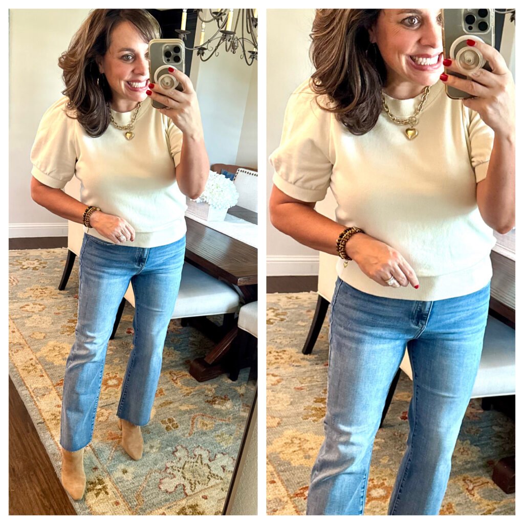 These Aliyah jeans are fabulous, and although they aren’t on sale, they are only $68. They are stretchy, comfy, flattering as all get out, and what I consider to be a perfect straight leg option. And since they are clean without any distressing, they are appropriate for jeans days at work! I know that wide leg jeans and barrel jeans are all the rage right now, but I have to say, I still find a nice straight leg jean to be the most figure flattering by far. These are a mid to high rise with a slightly frayed hem. I like the length with these booties, but I might actually cut a bit of length off so they will show a little ankle on me when wearing sneakers or flats. For size reference, I find them to be true to size. I’m wearing a 27.