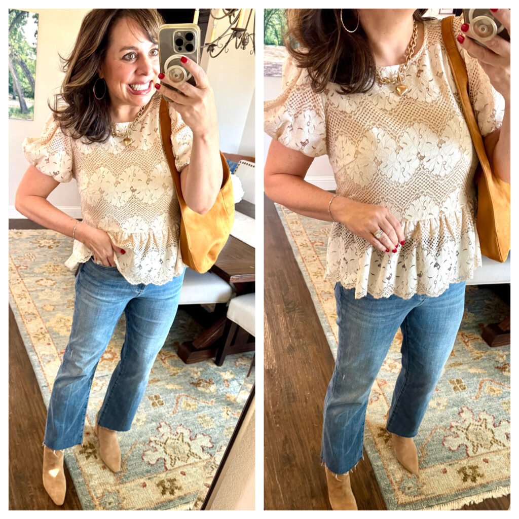 This lace peplum blouse was what I wore to the first night of the reunion, and I felt cute and comfortable in it. It has 40 reviews, and the great majority are 5 STARS. Y’all know I often adore a little peplum hem, and this one is definitely worthy of my adoration with the lacy material and subtle scallop hem. The sleeves have a bit of volume (but just a bit), and the lace is gorgeous. I did wear a neutral cami under it, and it was perfect. For size reference, I’m wearing a medium.