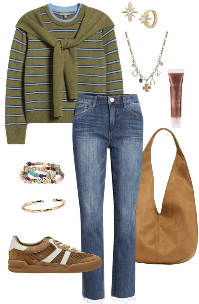 twofer tie sleeve sweater / must have straight leg ankle jeans / suede hobo bag / sneakers / huggie earrings / charm necklace / lip gloss / bracelet trio / gold bracelet