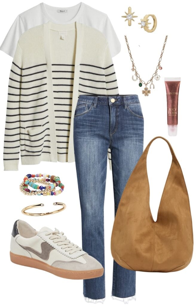 white tee / striped cardi / must have straight leg ankle jeans / suede hobo bag / sneakers / huggie earrings / charm necklace / lip gloss / bracelet trio / gold bracelet