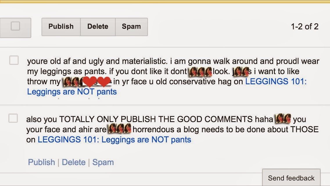I mean, for real. It amazes me what people think is okay to type out in a comment box on a blog. Geez! But are you surprised? She thinks leggings are pants. NOT OKAY!