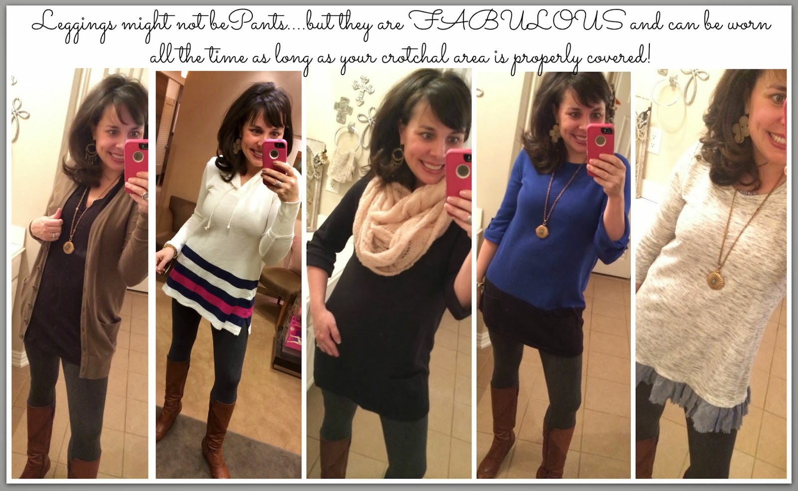 In the original post I highlighted several different types of leggings, but since then I found THE BEST PAIR OF LEGGINGS KNOWN TO MAN and named them a MUST HAVE! And, many of the things I talked about in the first post are no longer available, so I’ve found similar items that are current (and still available). I also have pictures of my own personal leggings outfits that I’ve created after buying the MUST HAVE leggings for myself.
