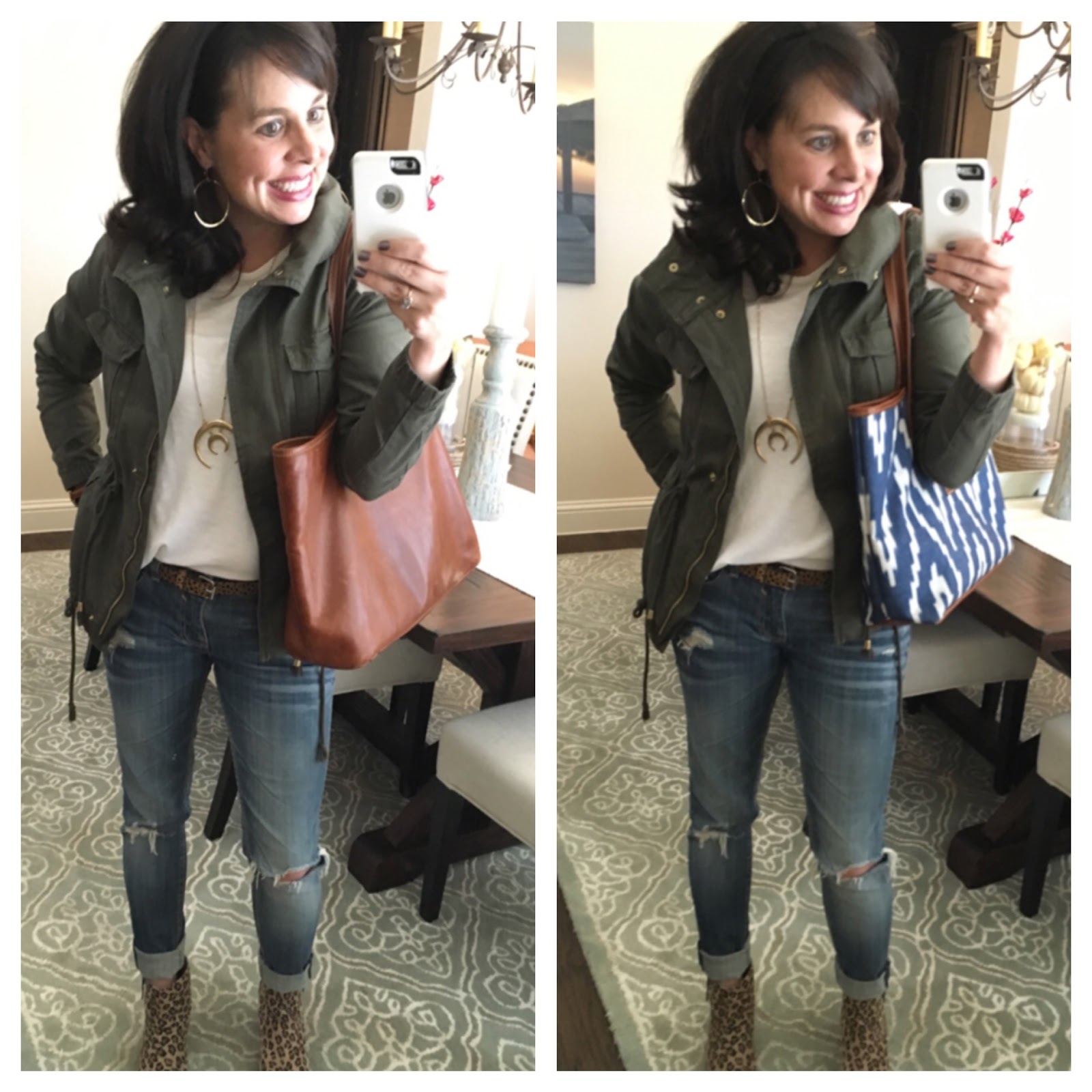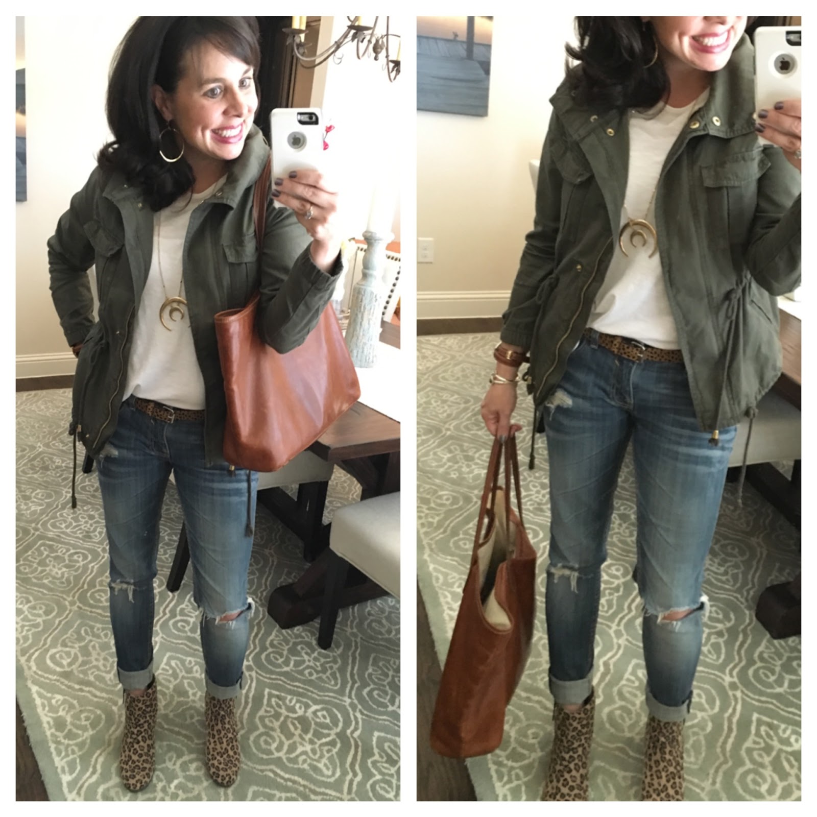 similar military jacket / white tee / similar jeans from same maker / leopard booties (order 1/2 a size up) / earrings / crescent moon pendant necklace
