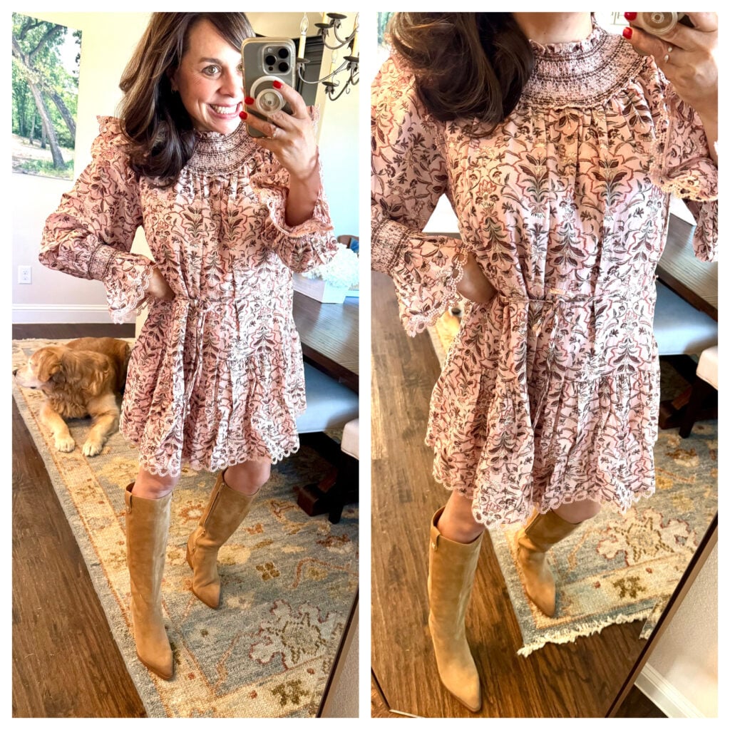 This smocked lace minidress didn’t work for me because it was too much fabric for my frame. However, I’m still showing it because I do think a lot of you will like it. And right now it is 40% OFF! It’s a cotton blend (more soft than crisp), and it has great ruffle and smocked detailing at the neck and the sleeves. I love the tiered skirt, and it’s got a skinny little tie belt that helps define your waist. As I said before, I thought it was too much on me, but I think lots of you will like it (especially you taller gals).