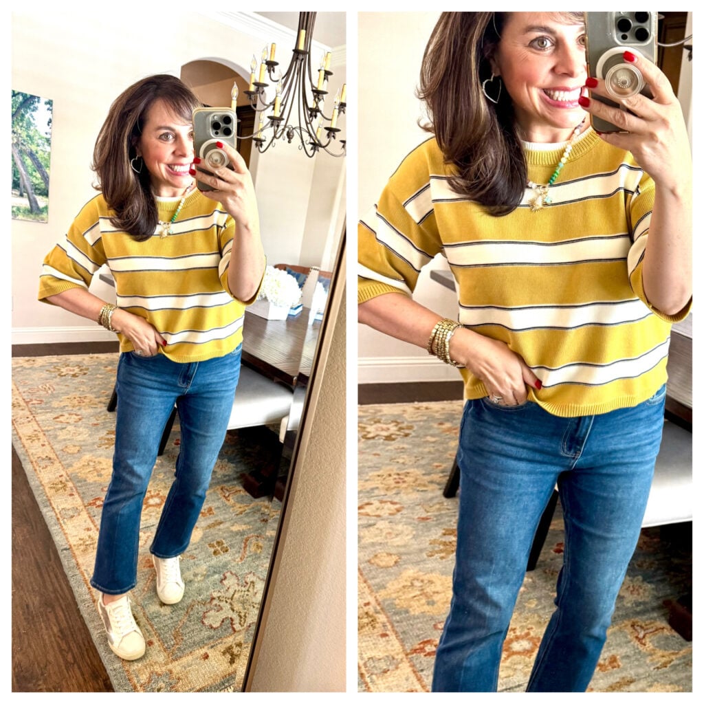 This striped sweater is good for right now on warmer days, but you will for sure be able to wear it all the way into late spring. It’s a little boxy, a little oversized, a little sporty… and a whole lotta cute. It’s a mid-weight with some stretch, and I really like the longer sleeve length and the cream layer peeking out underneath the crew neck for a double collar. I think it’s meant to be worn out, but as you’ll see in the next picture, I also like it with a half tuck. For size reference, I’m wearing a medium.