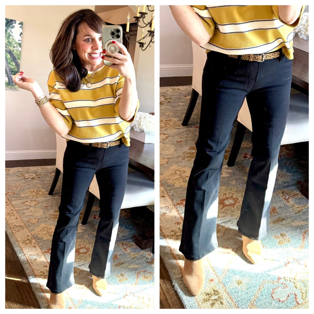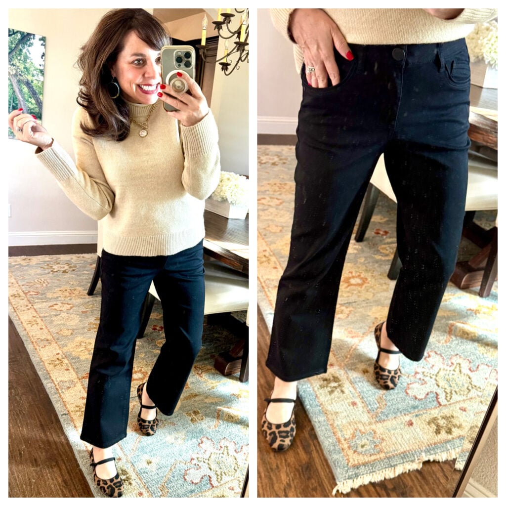 These black Wit and Wisdom jeans are higher waist, an ankle length, and a flattering flare him silhouette. They’ve got a great amount of stretch (they’re from Wit and Wisdom after all!), but they hold their shape. For size reference, I’m wearing my regular size 4.