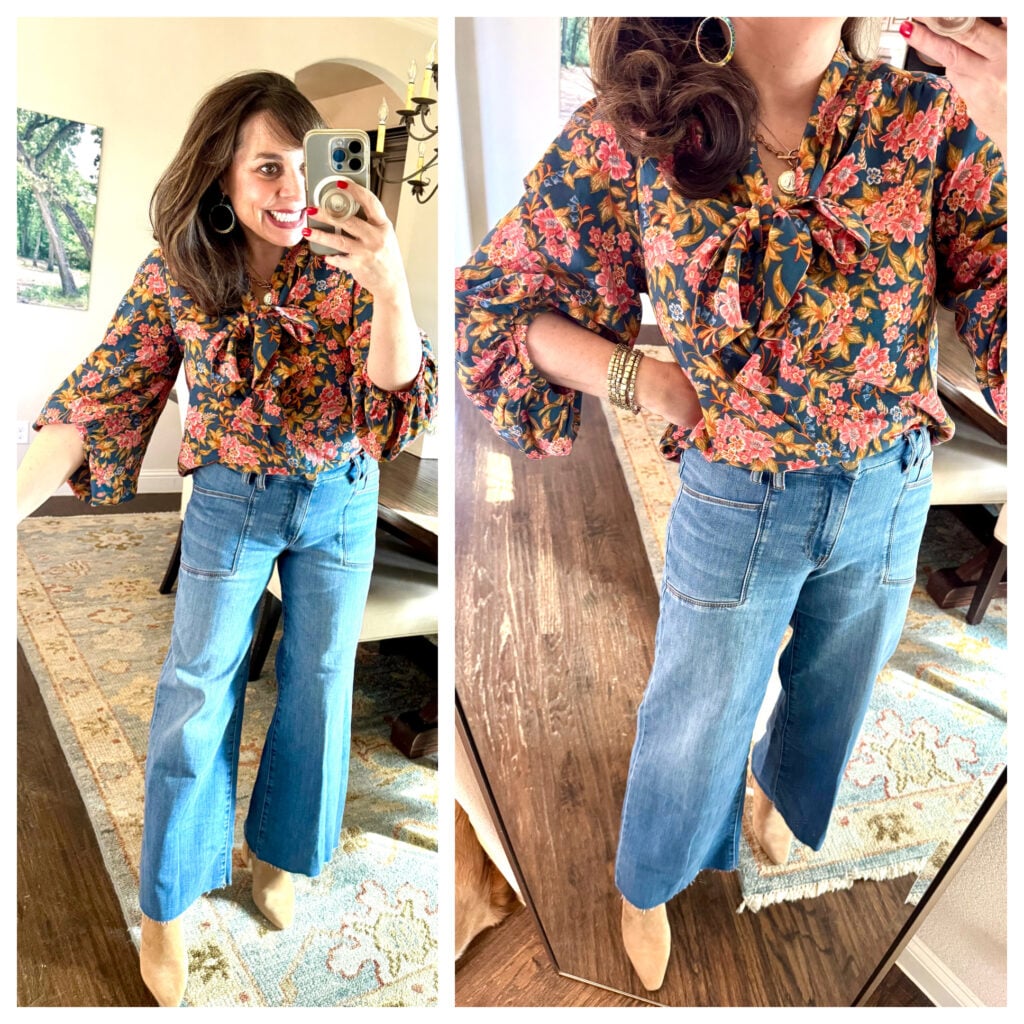 This floral blouse has a bit of a boho vibe, and I have to say I’m diggin’ it. It’s a beautiful navy, rose, mustard, and cream floral pattern. It has billowy balloon sleeves (see picture on left) that hit a bit below the elbow with an elastic fit, and it’s got a tie at the neckline that can be tied into a knot or a whimsical bow. For size reference, I’m wearing a medium here, but I think I would prefer the fit of a small. I think it looks great with these wide leg jeans.