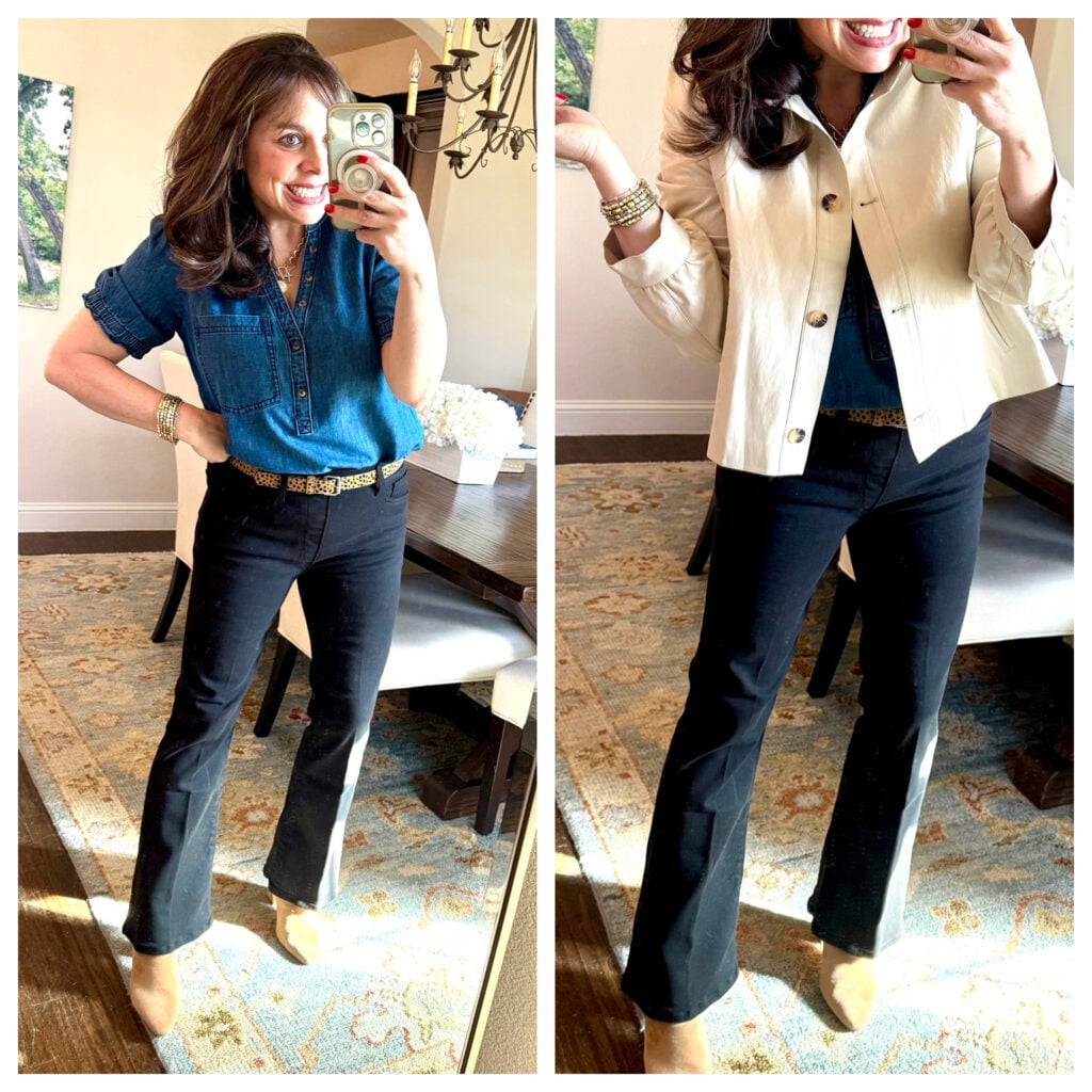 It’s made from a performance fabric that has a water-resistant finish, but I’m telling you it looks and feels like a lightweight and super soft leather. It’s beautifully made, and it looks very expensive and totally luxe. The cropped silhouette is so fun (hits mid-hip), and it’s got a swingy little fit. Pleated details across the shoulders, the back, and the cuffs are so pretty and feminine. And y’all know I love the stand-up collar. Ooh! And the tortoise shell buttons are a great touch too. For size reference, I took the online advice and ordered 1 size down and it was perfect. I’m wearing a small.