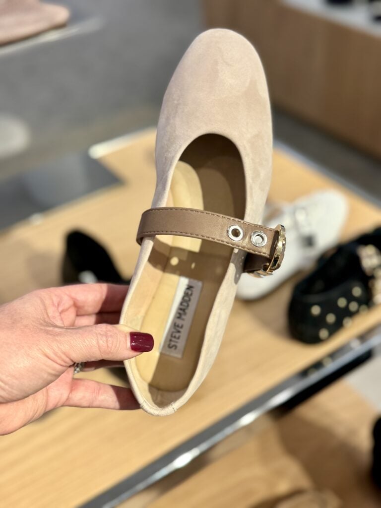 I tried this next pair on in store. These flats were incredibly comfy, and they have great reviews. The suede is buttery soft. Below you see the taupe suede, but there are 8 different color options (including some mesh options). True to size for me.