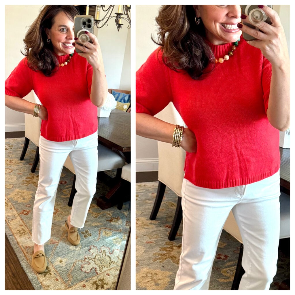It comes in a “vanilla white” too, but I couldn’t resist this gorgeous “tulip red” color. It’s a tiny bit of a boxy fit, but it’s not too boxy at all. The sleeve length goes down to the elbow, which I love. For size reference, I’m wearing a small.