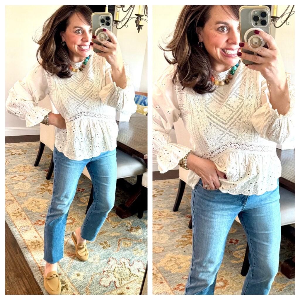 This top is special. With its peplum hem, balloon sleeves, ruffle trim, and lace design it seems to somehow combine feminine, vintage, and boho vibes. The body of the top has a bit of give to it, which I appreciate. For size reference, I’m wearing a medium. I’m loving it with the black denim.
