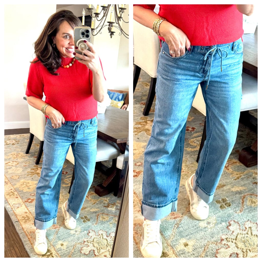 These drawstring jeans are unlike anything I have in my closet right now, and I’m really loving the casual vibe of the drawstring and the rolled-up cuffs. When styling these jeans, I do think a top that’s more on the fitted side will be the best choice with these so you can tuck it in the top and highlight the waistband. As you can see here, I’m wearing a plain white tee, but I’ll be styling them with other fitted tops in the future. For size reference, I’m wearing my regular size 4.