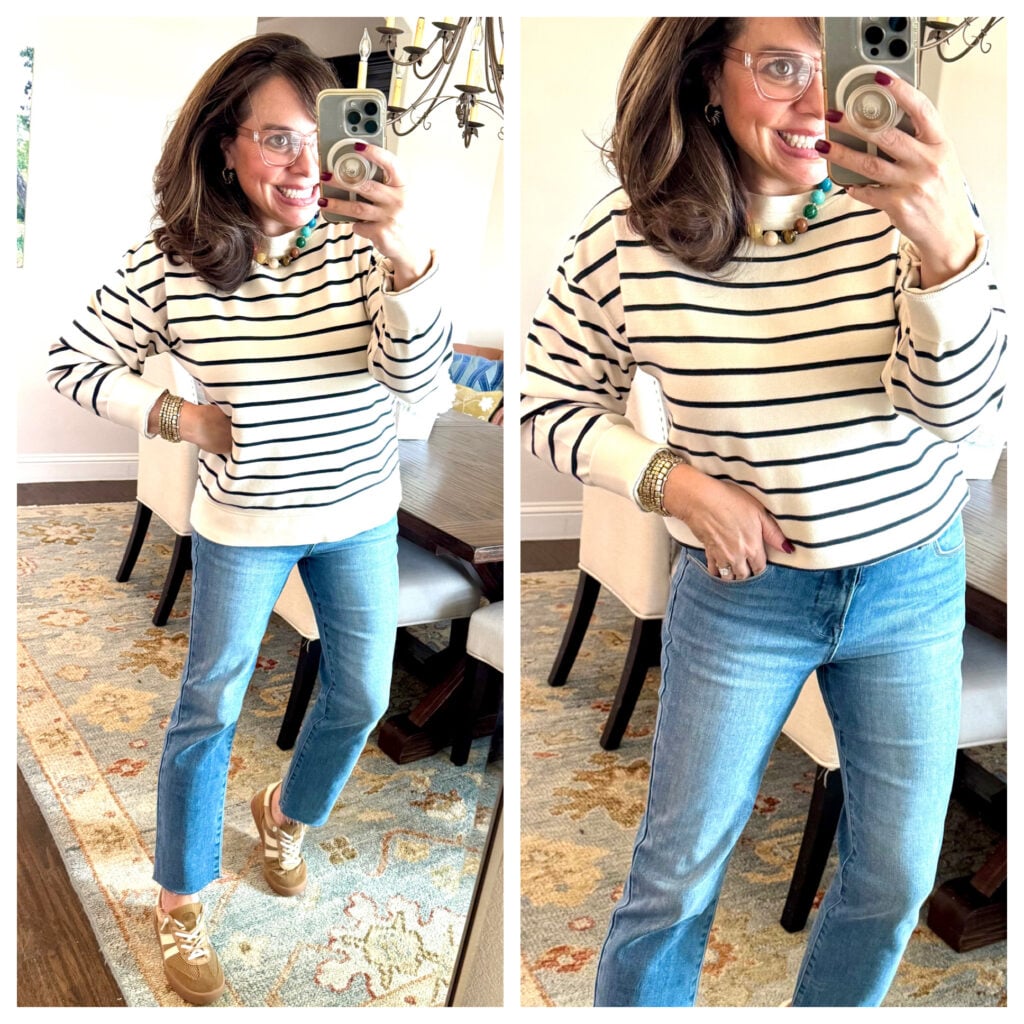 This striped sweatshirt is going to be a closet staple for me. It’s got an oversized slouchy fit, and I love it. This one is a creamy ivory with a navy stripe, but it also comes in a navy with a white stripe. It’s really soft and it has a little bit of stretch (which is awesome). For size reference, I’m wearing the medium. The small would definitely fit too, but I liked this fit.