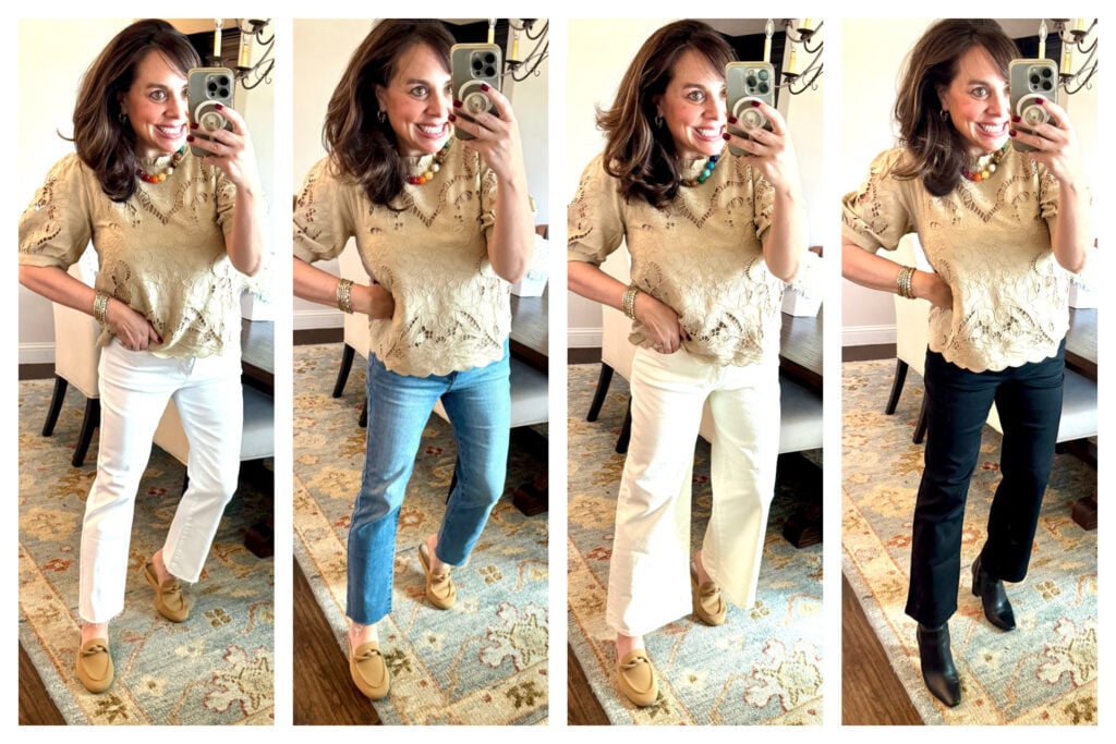 mixed media lace top / earrings / chunky necklace (option HERE) / bracelet stack / ankle jeans / neutral Rothy’s option