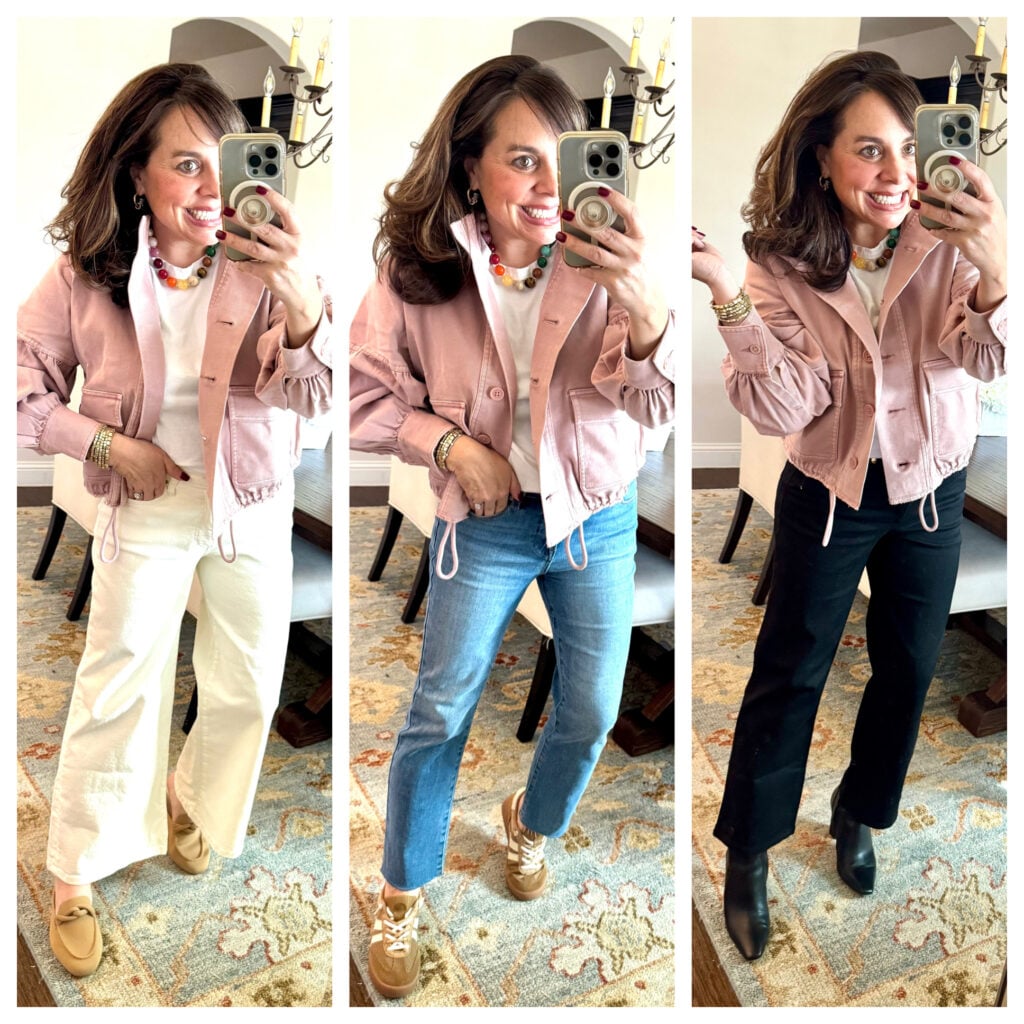 This twill utility jacket caught my eye last week. First of all, I’m completely smitten with the color. It’s a very pretty pale pink. I’m also loving the cut and fit. It’s oversized, the sleeves are a bit blousy with tiny little pleats on the cuffs, and y’all know I’m a huge fan of the exaggerated collar. I would suggest sizing down in this one. For size reference, I’m wearing a small.