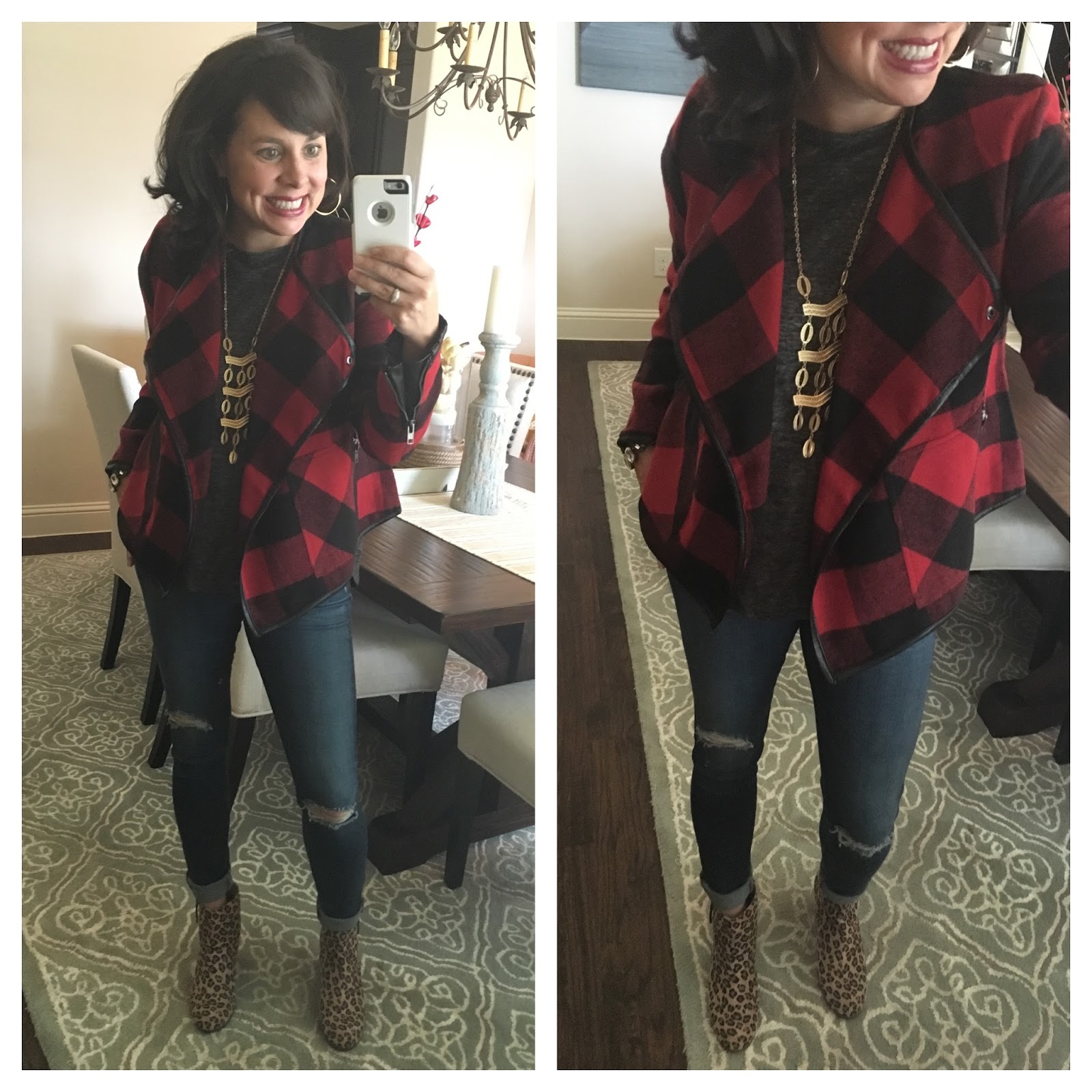 buffalo check moto jacket / dark grey shirred back tee / AG skinny ankle jeans HERE / leopard booties / earrings / necklace (PTMTMUSTHAVES25 will get you 25% OFF the necklace!)