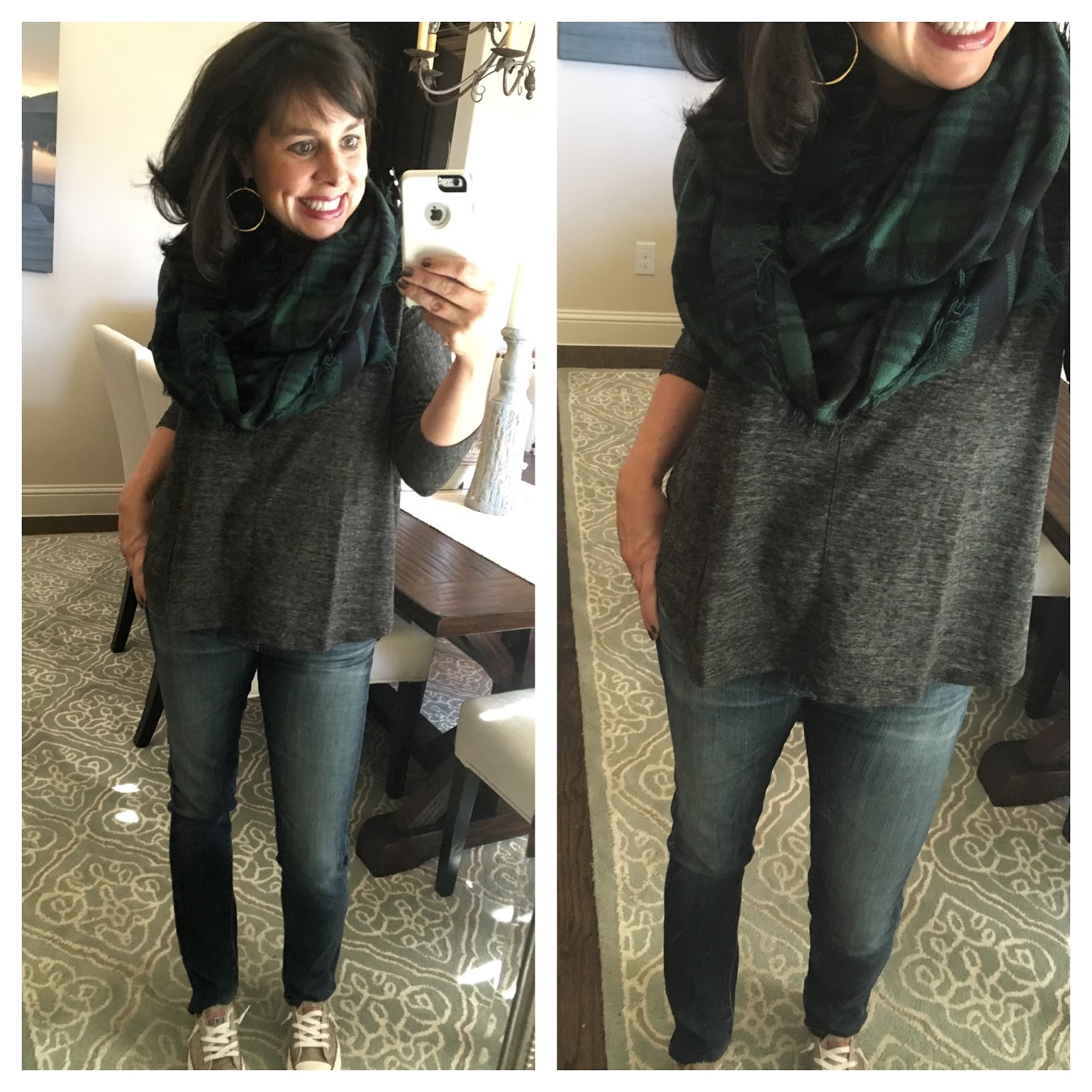 plaid infinity scarf / shirred back tee HERE from LOFT /