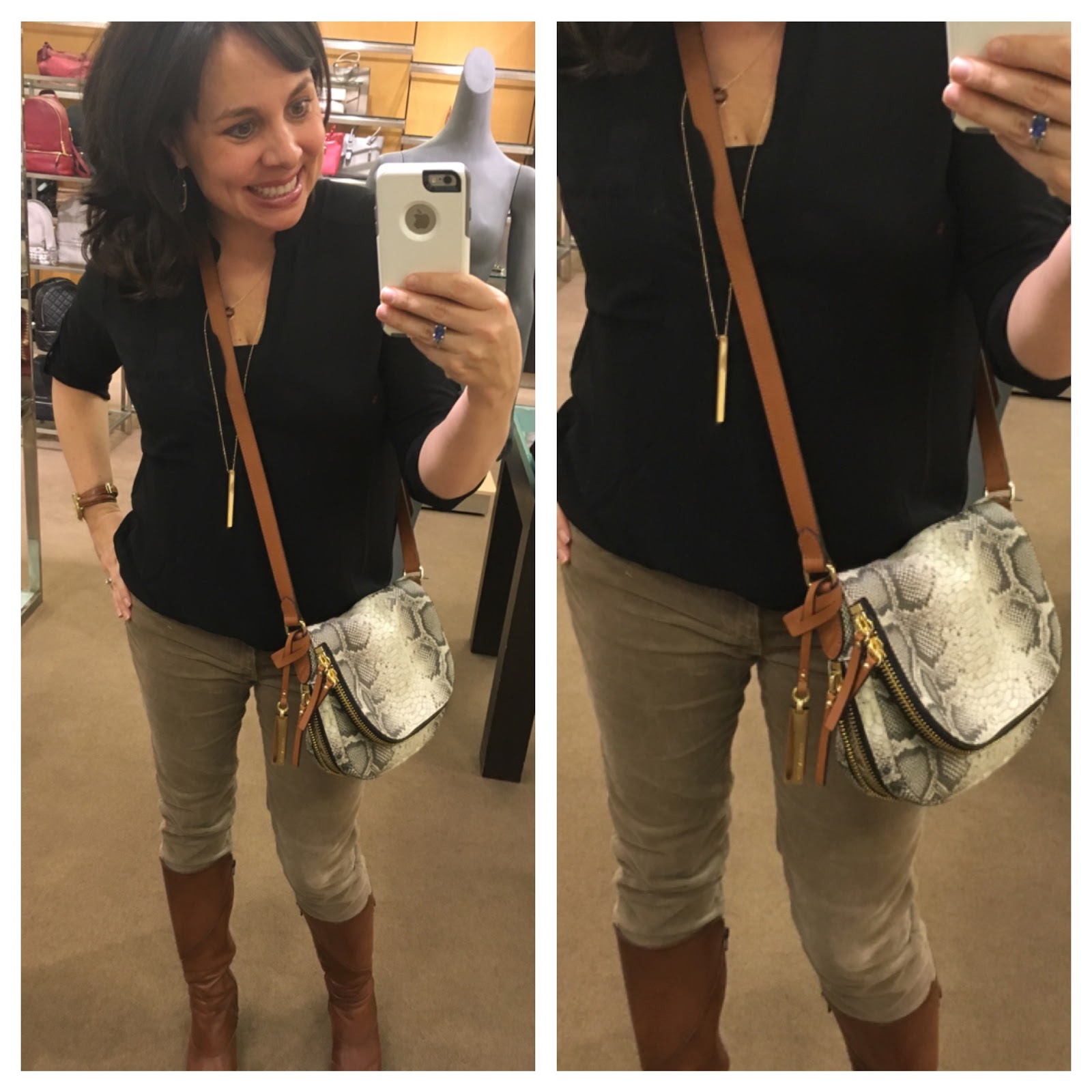 long bar pendant ($18!) / abalone earrings / leather wrap watch / similar cognac boots