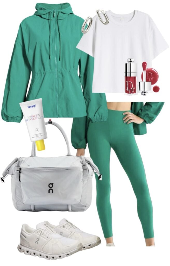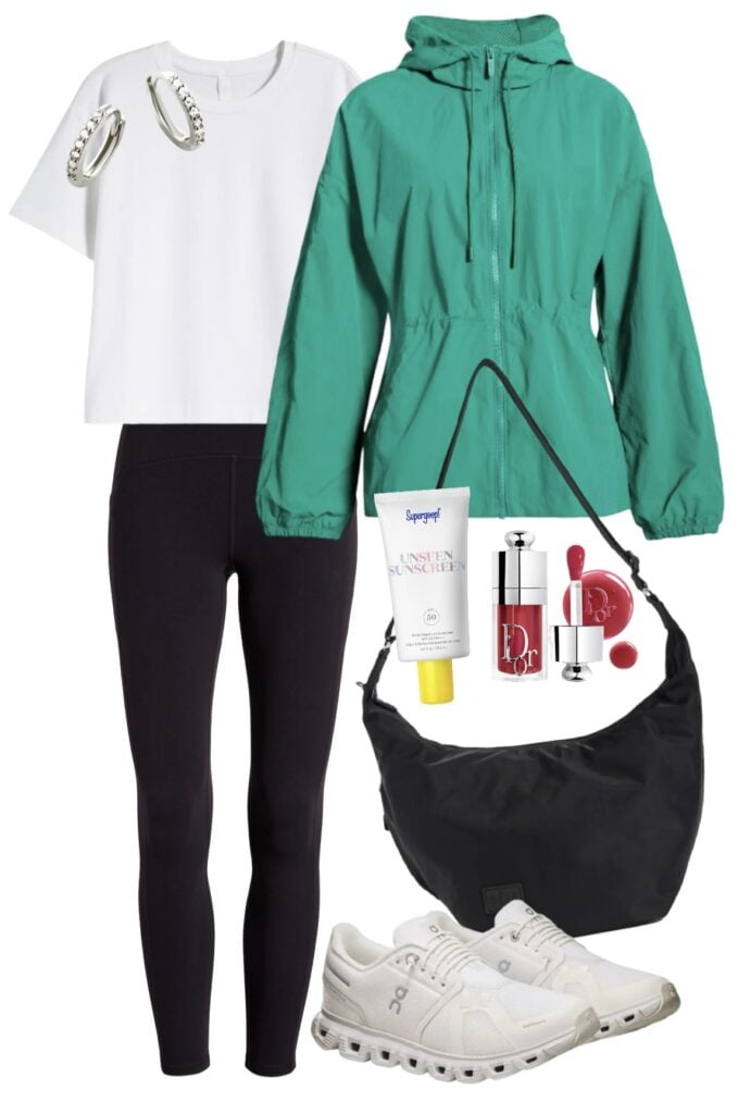 cinched jacket / leggings / white tee / huggie earrings / lip gloss / gym bag / Unseen Sunscreen / sneakers