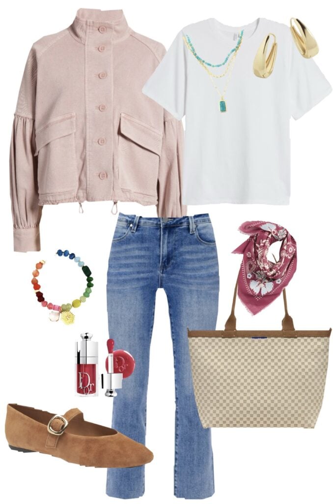 twill utility jacket / tee / necklace / earrings / jeans / Rothy’s tote bag / Mary Jane’s / bracelet / lip gloss / scarf