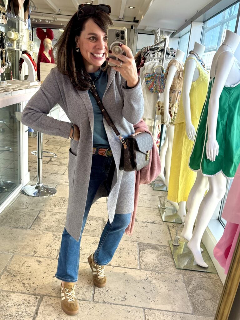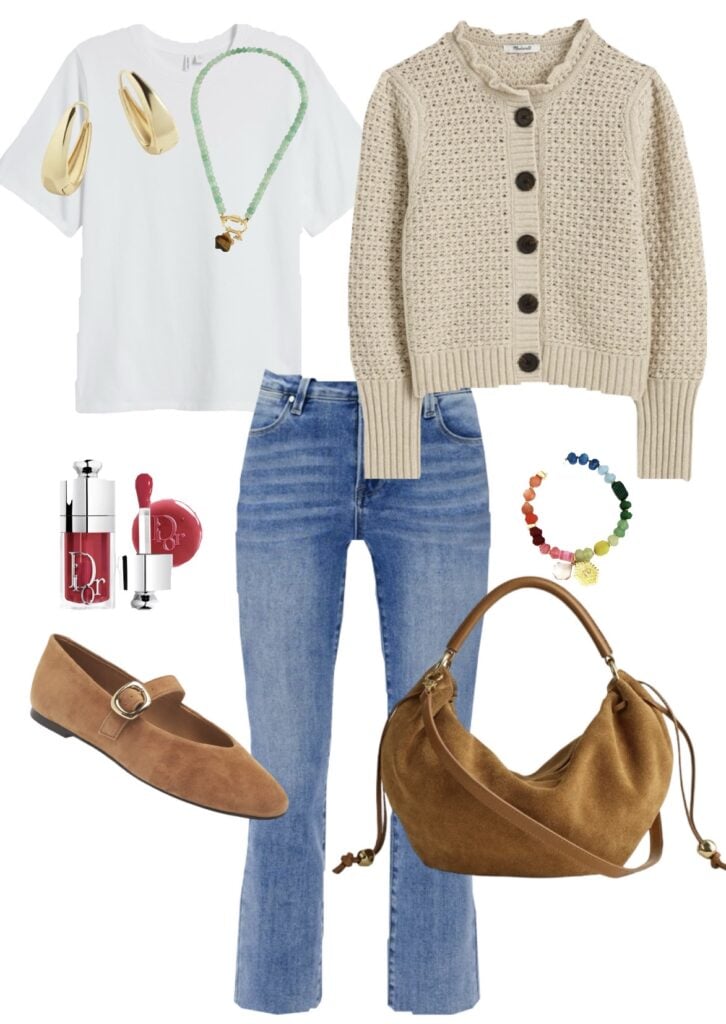 And how cute is this cardi! We’ve got the same tee, jeans, and jewelry as the outfit above.
