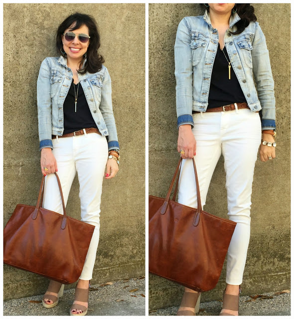 And one of my favorite looks with the jacket with a grey tee, white jeans, gold jewelry, and cognac sandals!