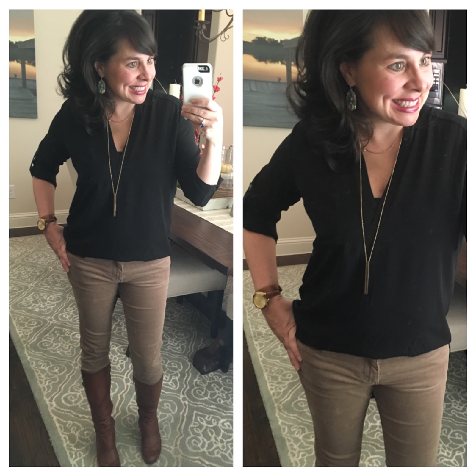Her shirt looks colorful in the photo below, but it was just a black and white plaid…..and I loved that she was mixing black and brown! I found a similar top HERE. I tried the small on for myself and it was too small, so I would say size up in this shirt.
