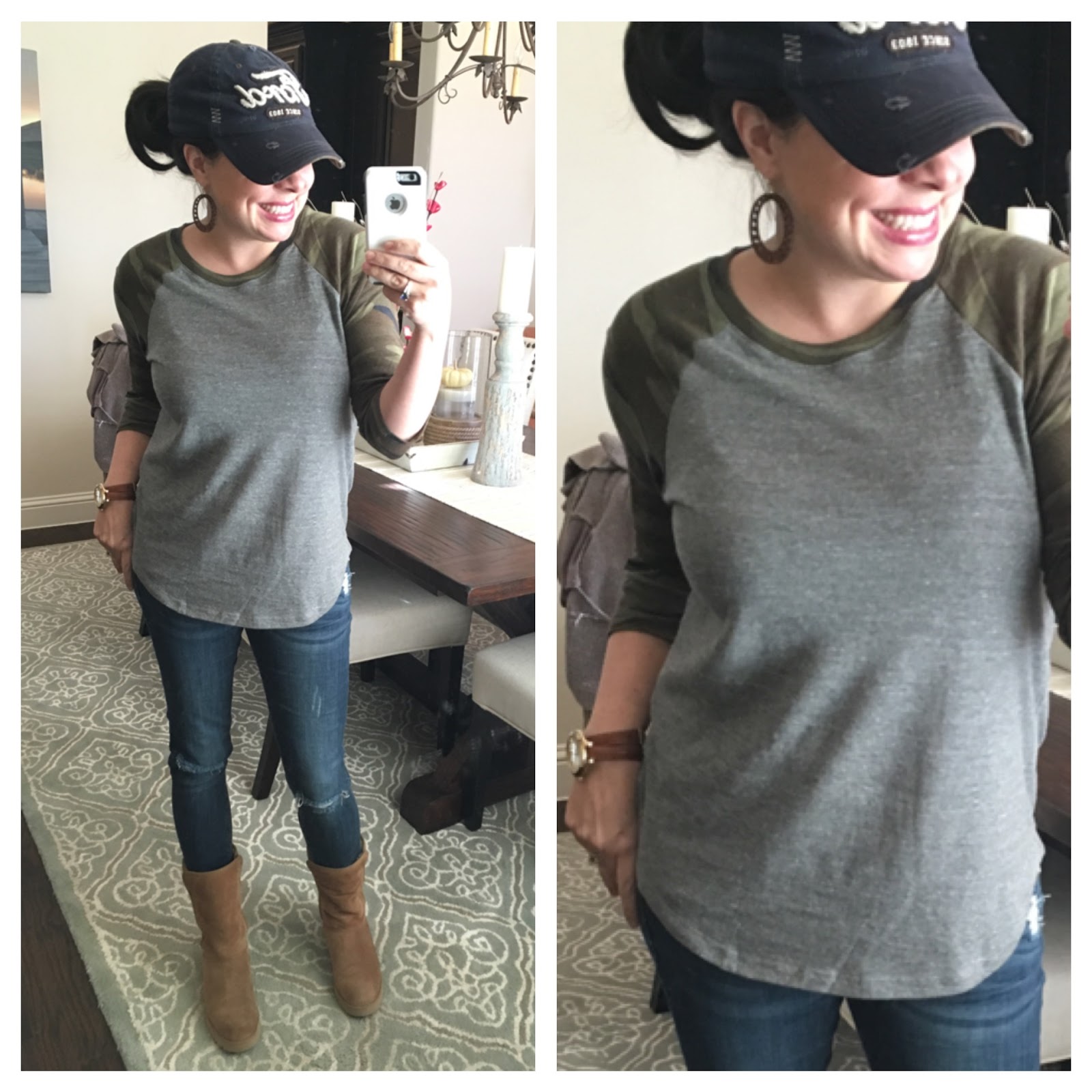 camo tee / wood earrings / similar jeans ON SALE! / slim profile UGG boots / leather watch
