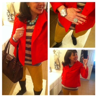 so cool that you used the color pattern to create a bright, adorable outfit! I love the mustard skinnys, and the coral coat is perfect for February 🙂