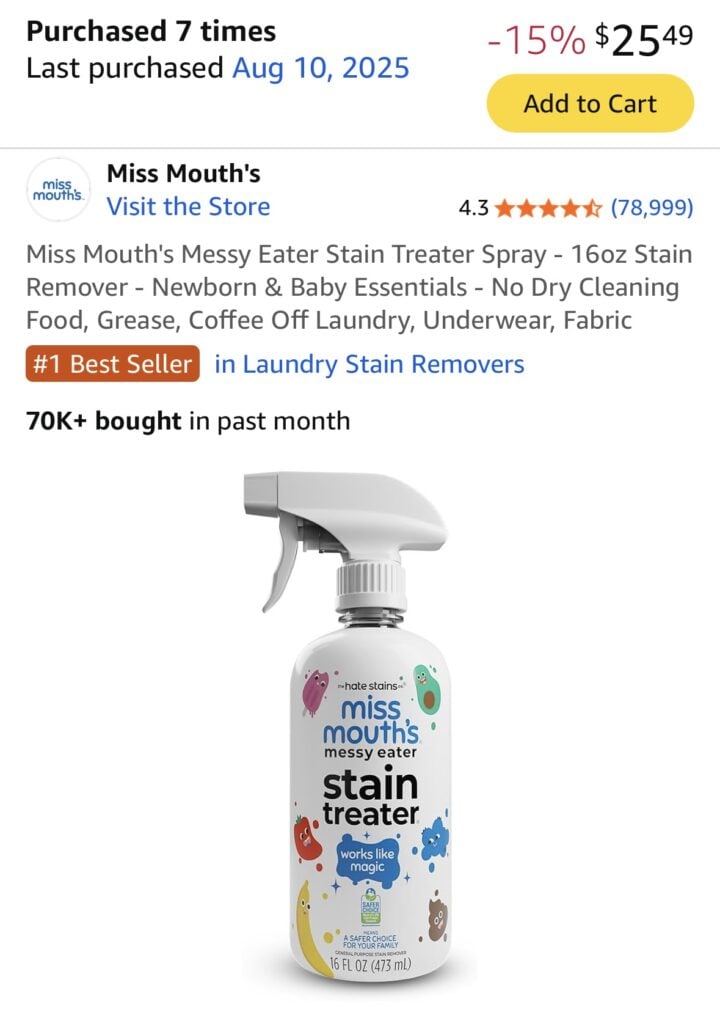 Look at how many times I’ve purchased this stain treater. I’m telling you, I’ve been using it for probably 3 years now, and there is NOTHING it hasn’t gotten out. I’m always most impressed with the greasy oily stains (you know, the ones that don’t really have any color) that are SO FREAKING STUBBORN. Well, they don’t stand a chance with this spray.