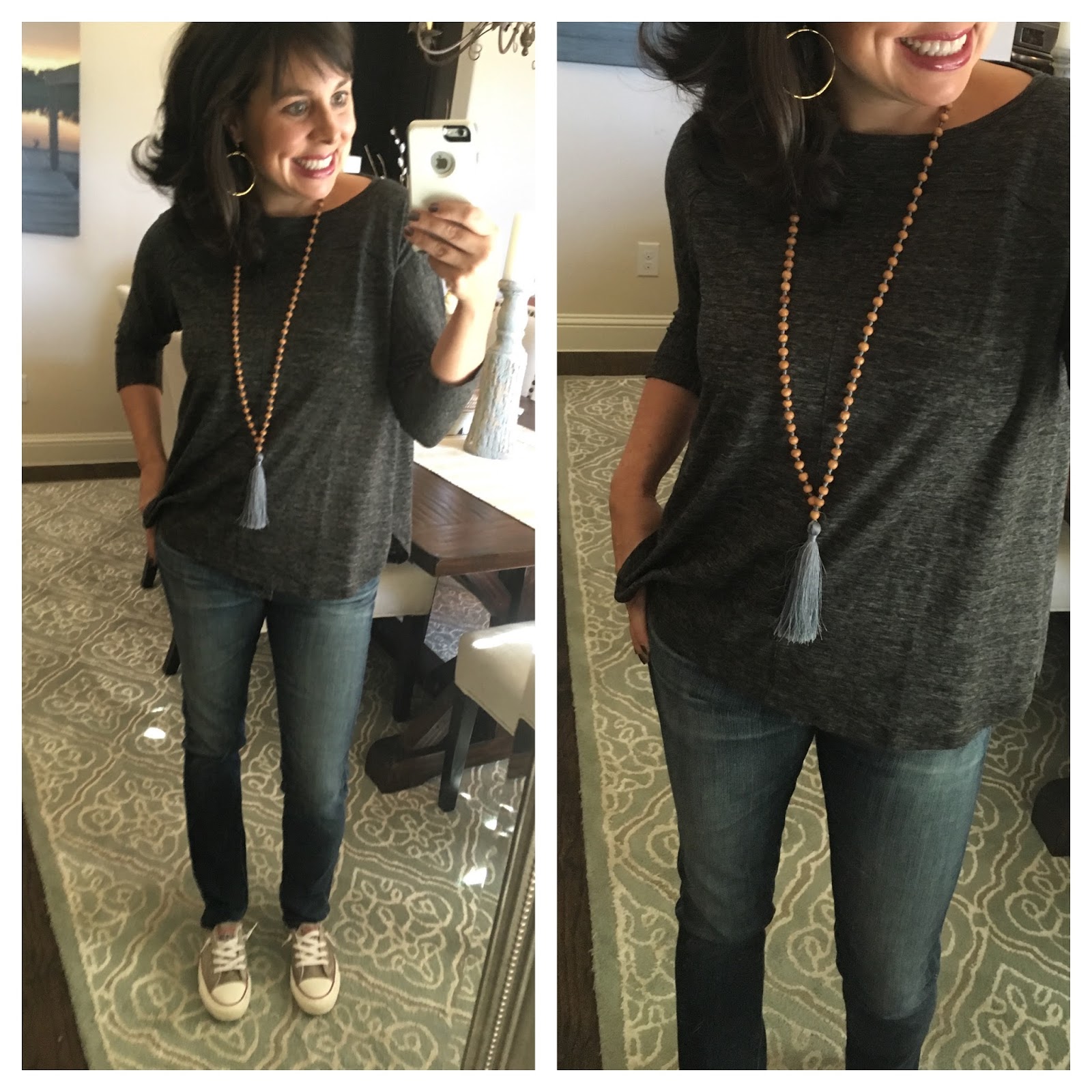 So cute!!!! Do you remember what color the tunic v-neck t-shirt is? It looks grey but not charcoal. I can't tell from the Loft website which one you are wearing.