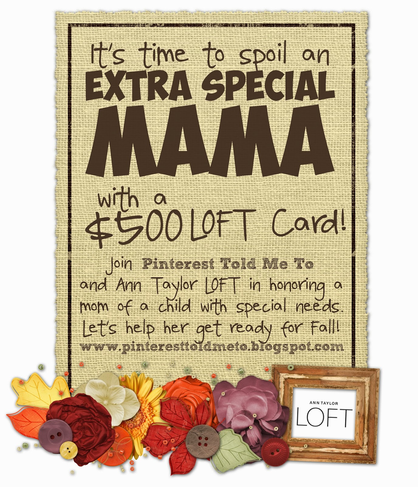 We know these sweet mamas often do without, so LOFT and Pinterest Told Me To want to celebrate 1 of them with a $500 gift card to LOFT (thank you LOFT!) and some extra items