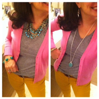 Carmel is a little gem (you like that? jewels…gem?!) You look great in those mustard pants…and love them with the pink cardi!