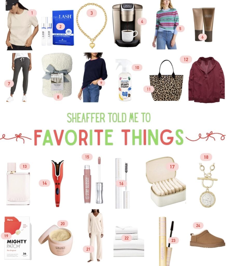 1) puff sleeve sweatshirt / 2) neuLASH lash enhancing serum / 3) heart toggle necklace / 4) brushed gold Keurig / 5) fair isle sweater / 6) Ethereal Glow Serum / 7) must have joggers / 8) cozy throw / 9) tipped crewneck sweater / 10) stain treater / 11) Rothy’s leopard tote / 12) Oh Snap sweatshirt / 13) Burberry Her / 14) Chi Spin N’ Curl curler / 15) Stay Glossy lip gloss / 16) mascara primer / 17) travel jewelry case / 18) coin toggle necklace / 19) Mighty Patch pimple patches / 20) Colleen Rothschild hair mask / 21) Barefoot Dreams lounge set / 22) Boll and Branch sheets / 23) tarte XL tubing mascara / 24) Ugg micro slip-ons