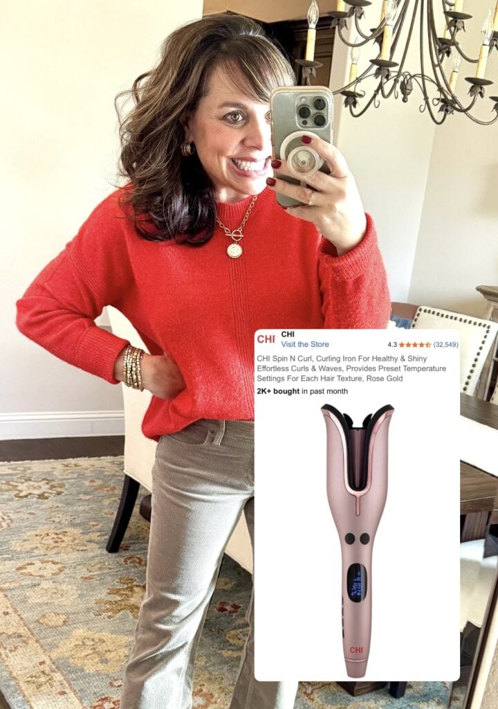 14) Chi Spin N’ Curl curler / On the days that I want my hair to look its best, I always use this Chi Spin N’ Curl Curler. I’ve heard from readers and friends that they think it’s scary and they are afraid of getting their hair caught and twisted in it, but I’ve been using it for well over a year and that has never even come close to happening to me. It’s SUPER user friendly. All you do is place the hair into the curling chamber and then push either the left or right arrow depending on which way you want the curl to go. I like the curl going away from my face, so I choose the arrow accordingly. It does all the work for me, and it beeps when it’s done with each curl. Again, I don’t use it every day, but I do use it every single time I want my hair to look its best.