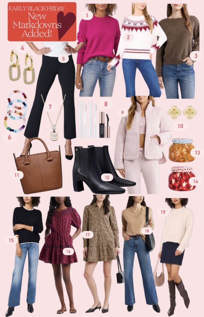 1) exposed seam sweater / 2) fair isle sweater / 3) boatneck sweater / 4) huggie drop earrings / 5) SPANX ponte pants / 6) bracelet stack / 7) necklace / 8) mascara primer duo and mascara / 9) Zella quilted packable jacket / 10) Tory Burch stud earrings / 11) cognac crossbody bag / 12) Tory Burch boots / 13) fall candle / 14) holiday candle / 15) tipped crewneck sweater / 16) tiered mini dress / 17) poplin shirt dress / 18) cashmere v-neck sweater / 19) diamond pattern sweater
