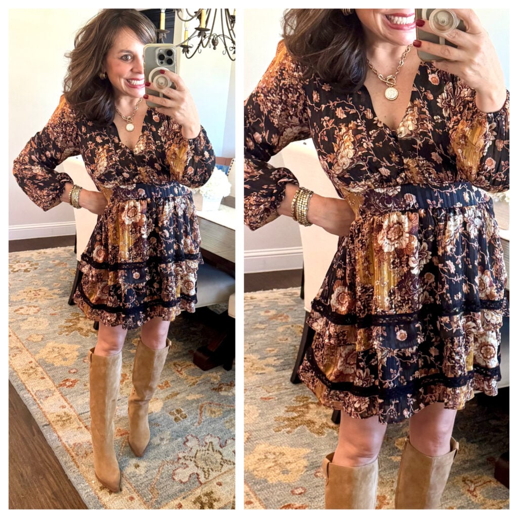 This tiered hem mini dress is figure flattering with a fitted waist, a deep v neckline, and a short and fluttery tiered skirt. The brown and black floral is very on trend, and I love the bit of volume that the sleeves have. It does lean nighttime because there’s a bit of metallic thread running through the dress that gives it just a bit of sparkle. For size reference, I’m wearing a medium.