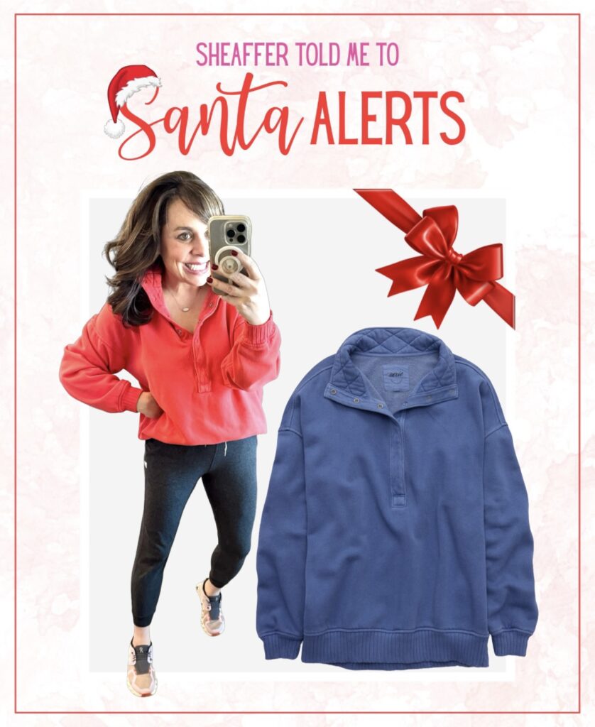 OH! And I ordered the #15 tipped crewneck sweater (in navy tipped with pink) for myself earlier this week, and I tried it on this morning AND LOVE IT. Size down for sure. I got the small and it’s still quite roomy, but I like it that way! This would be a great gift too!