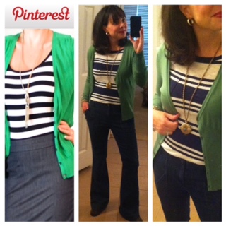 Now to the real stuff that matters, I have a green cardi and trouser jeans. Gotta get me a navy white striped top (the one I have is long and flows, not right). What shoes should I pair?!