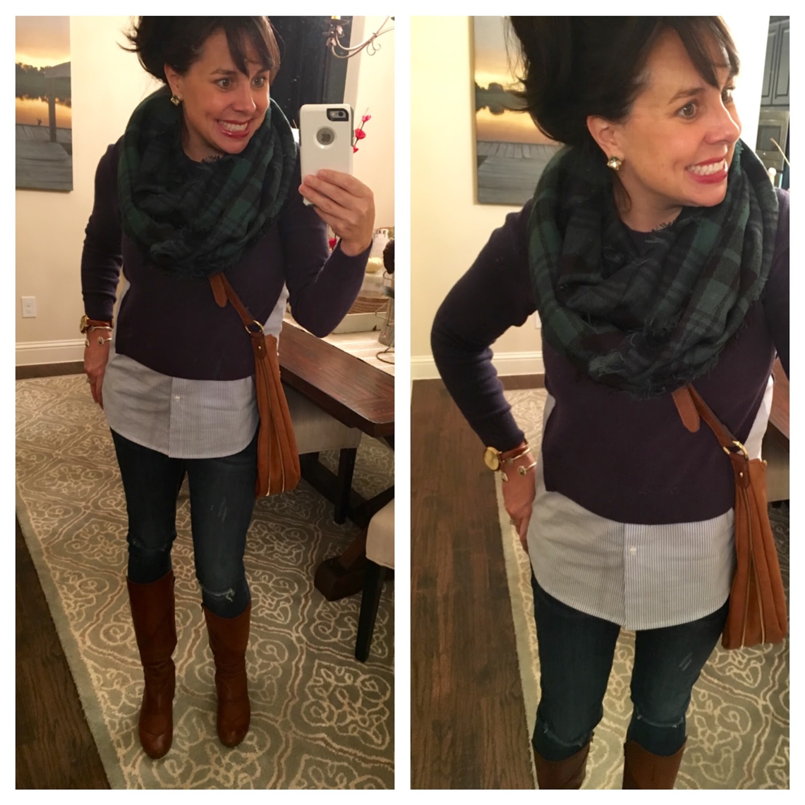 plaid infinity scarf / similar sweater ON SALE! / similar cognac cross body/ faceted stud earrings/ double wrap leather watch / drusy bracelet (on left) / pyrite bracelet (on right)